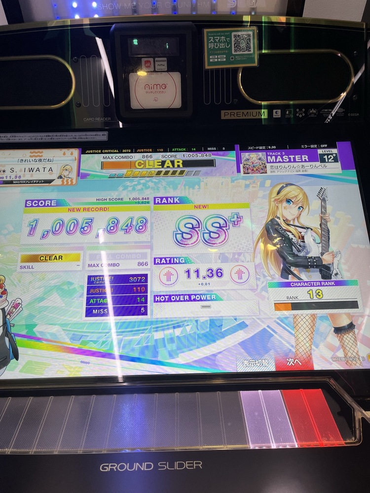 恋はりんりん☆あーりんベルという曲でこないだのリザルト、最高記録出た!嬉しいけどけど鳥寸っていうのが悔しい(;`皿´)グヌヌ